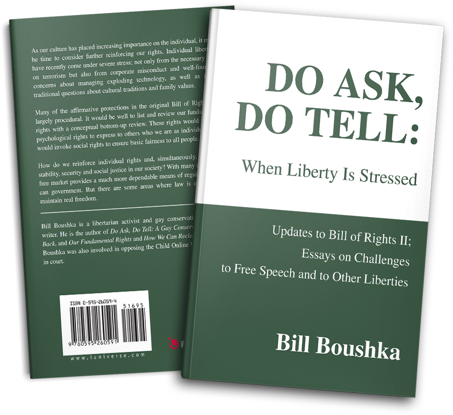 The Bill of Rights, reinforced by several important subsequent amendments to our Constitution, is expected to protect us as individuals from whims and abuses by government. As our culture has placed increasing importance on the individual, it may be time to consider further reinforcing our rights. Individual liberties have recently come under severe stress, not only from the necessary war on terrorism but also from corporate misconduct and well-founded concerns about managing exploding technology, as well as more traditional questions about cultural traditions and family values. Many of the affirmative protections in the original Bill of Rights are largely procedural. It would be well to list and review our fundamental rights with a conceptual bottom-up review. These rights would include psychological rights to express to others who we are as individuals and would invoke social rights to ensure basic fairness to all people. How do we reinforce individual rights and, simultaneously, maintain stability, security and social justice in our society? With many issues, the free market provides a much more dependable means of regulation than can government. But there are some areas where law is essential to maintain real freedom. This book is primarily intended to update the vision in Do Ask, Do Tell: A Gay Conservative Lashes Back (1997, 2000) given the new challenges to liberty posed particularly by terrorism and now corporate scandals, as well as the growing understanding of the legal and ethical problems that accompany the opportunities for self-expression presented by the Internet.